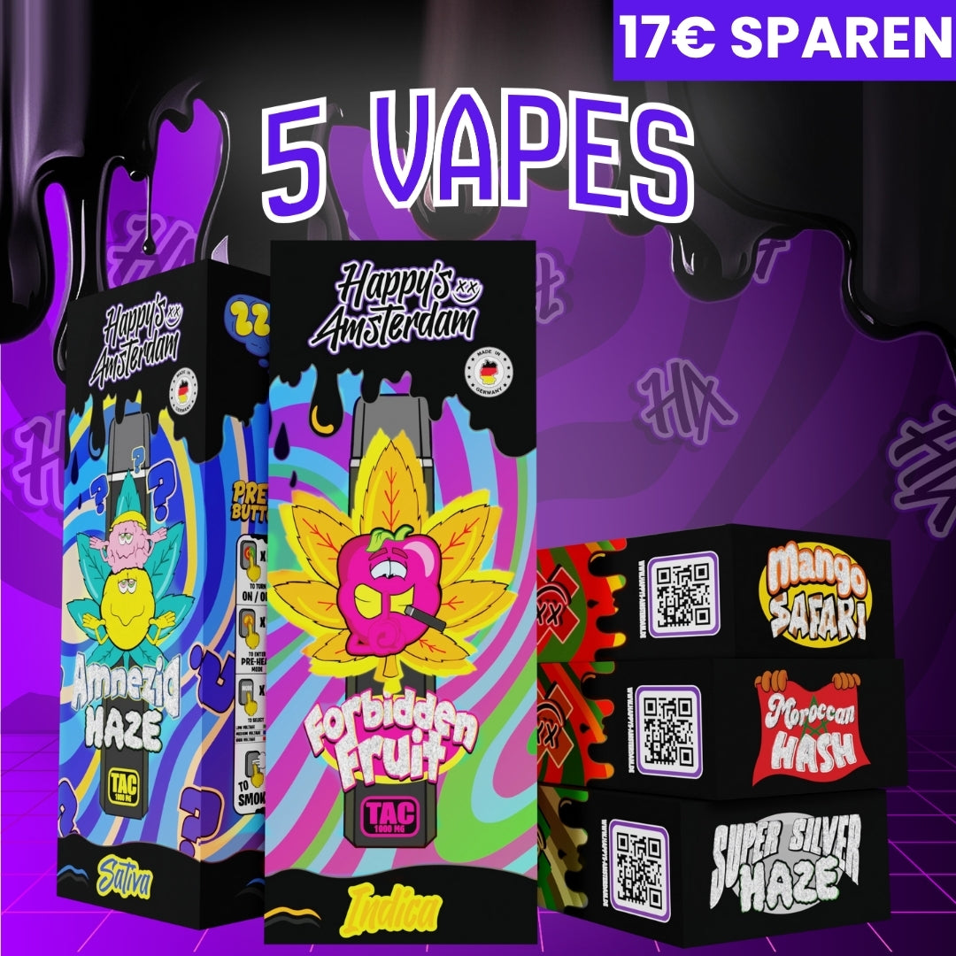 Erhalte 5x TAC Vapes in verschiedenen Geschmacksrichtungen. Premium-Qualität, 95 % reines TAC-Destillat, ideal für regelmäßigen Genuss.
